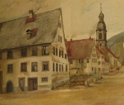 Links: Stadtansicht v. Johann Dorer, Gasthaus Engel und die alte Stadtkirche